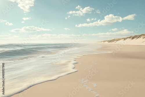 A realistic sandy summer beach, complete with gentle waves and a warm, sunny atmosphere, evoking the perfect beach vacation.