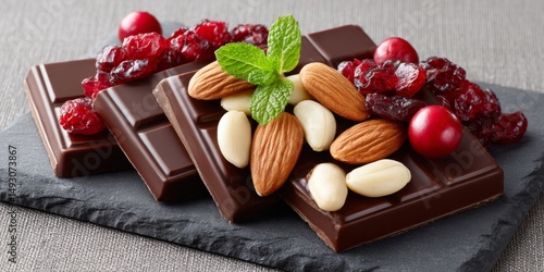 a realistic shot of chocolate bark with nuts and dried fruit arranged on a black slate