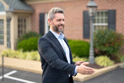 A realtor hands keys to a happy homeowner. Real estate agent inspects an apartment interior. Agent explains property financing. A real estate broker stands confidently outside a residential building.