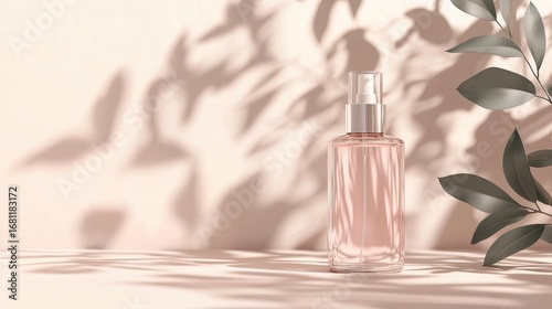 A rectangular glass bottle of light pink liquid with a silver spray top sits on a pale pink surface, backlit by soft light casting leafy shadows
