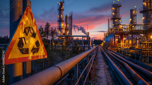 A recycling sign in front of an industrial refinery with smoke stacks and piping, set against a colorful dusk sky.