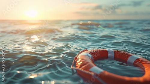 A red and white life preserver floats in the ocean at sunset, with the sun shining brightly in the distance.