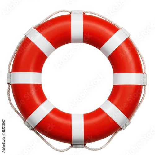 A red and white life preserver with rope on a white background in a studio shot for safety use