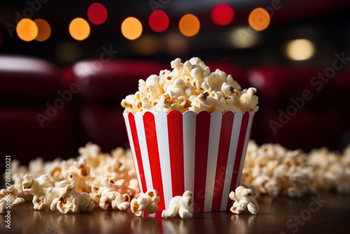 A red and white striped container filled with popcorn sits on a table in front of empty red theater seats.