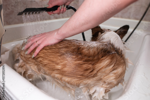 A red and white Welsh Corgi Pembroke stands in a bathtub while the owner rinses shampoo off its back with a shower. Rear view, water flowing down the wet dog’s fur