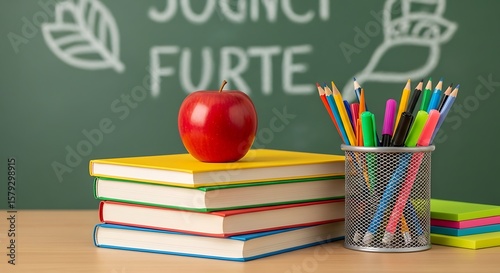A red apple sits atop a stack of books, contrasting with a collection of writing utensils in a container.