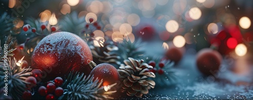 A red ball with snow on it is surrounded by pine cones and other ornaments