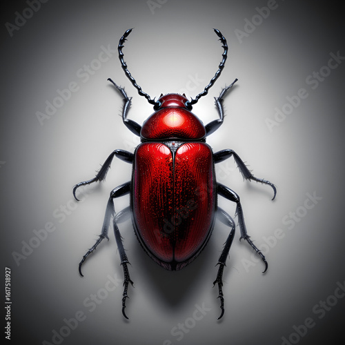 A red beetle with a reflective exoskeleton and striking black legs illuminated with dramatic lighting to emphasize its glossy