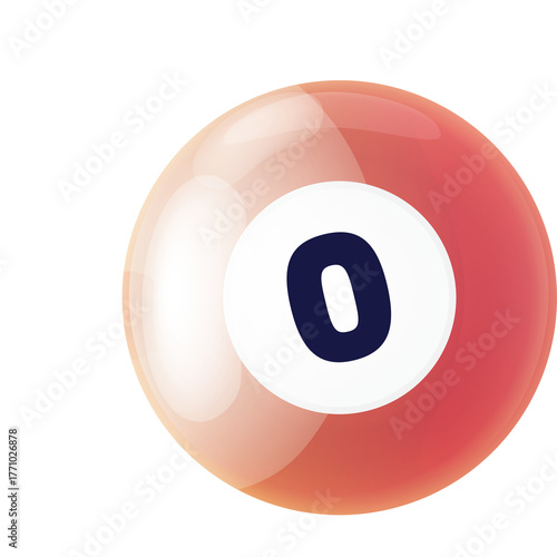 A red billiard ball numbered zero with a white circle and dark blue number on a transparent background with studio lighting and reflective surface