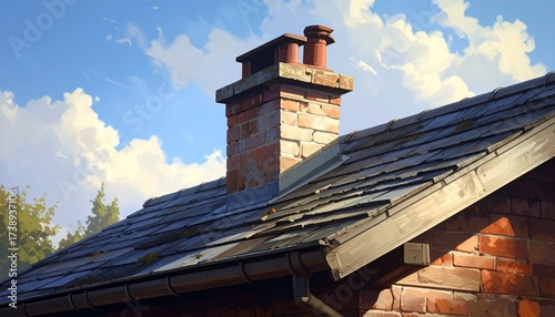A red brick chimney rises from a shingled rooftop scattered with autumn leaves, set against warm evening light and colorful trees—symbolizing seasonal charm, tranquility, and cozy architecture.