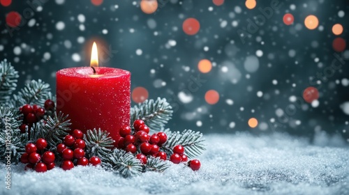 A red candle flickers among pine branches and berries, setting a cozy winter scene