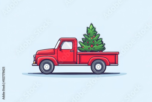 A red car with a Christmas tree on the roof, a flat design illustration, simple and cute. Vector art with a winter background