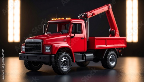 A red crane truck stands alert under vertical light panels—its extended arm mid-gesture, neither lifting nor resting. There's poise, precision, and a latent promise of action. Mechanized grace staged