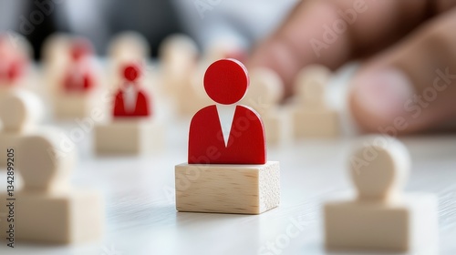 A red figure on a wooden block stands out among a group of blurred, similar wooden figures, suggesting recruitment, leadership or talent selection.