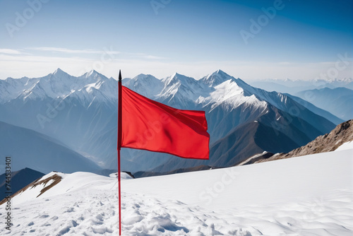 A red flag on snowy mountain peak, background for business achievements concept