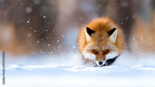 A red fox stealthily prowls through fresh snow in a tranquil winter forest landscape