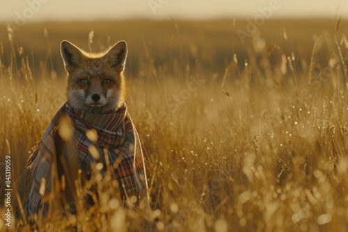 A red fox wearing a scarf sits in a natural field