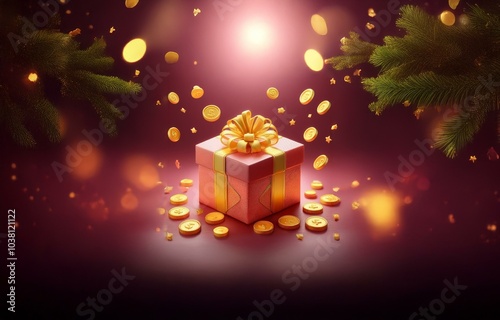 A red gift box with a gold bow and ribbon is surrounded by golden coins on a maroon background. The background also has green pine branches and blurry yellow lights.