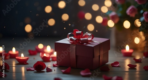 A red gift box with candles on a table, accented by rose petals and fairy lights, creating a dreamy Valentine's atmosphere.