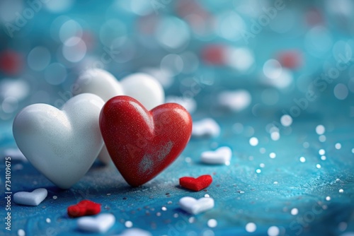 A red heart is surrounded by white hearts on a blue surface. Can be used for Valentine's Day or love-themed designs