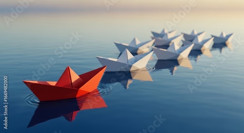 A red origami boat leads a group of white paper boats on calm water, concept for leadership strategy, business innovation and competitive advantage
