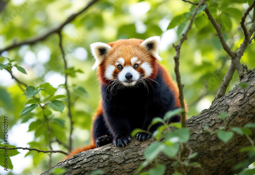 A red panda sitting on a tree branch surrounded by green foliage