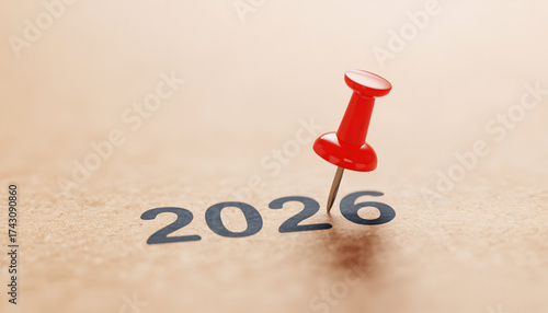 A red pushpin marks the year 2026 on a textured surface, symbolizing future planning and goal setting