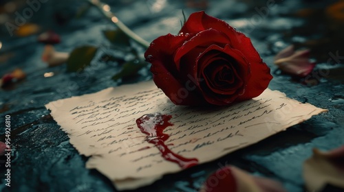 A red rose weeps blood onto a singed love letter, its petals dew-kissed, telling a tale of lost love and heartbreak.