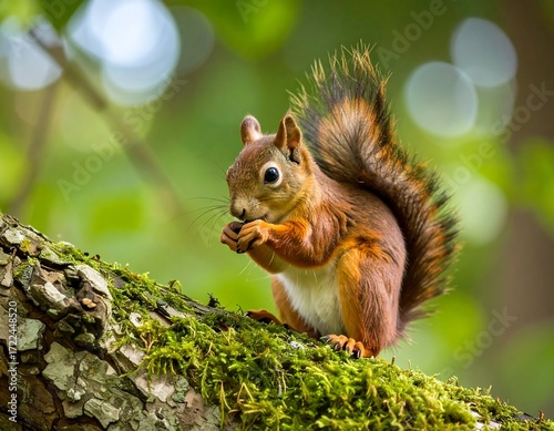 A red squirrel perched on a mossy tree branch, eating a nut. Focus on the squirrel, bokeh background