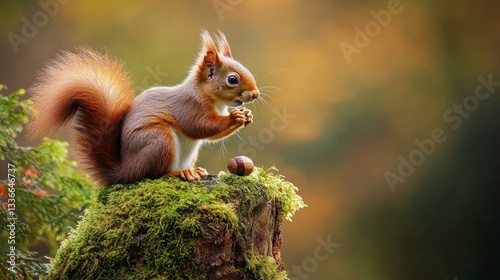A red squirrel perched on a mossy tree stump, nibbling on an acorn