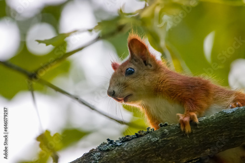 A red Squirrel sits on the branch and looks towards a camera. Close-up portrait of red squirrel.