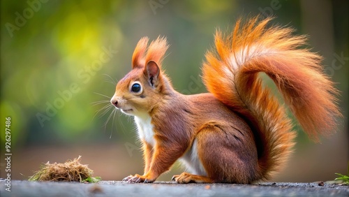 A red squirrel with fluffy tail looking curiously to the right