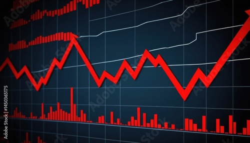 A red stock market chart illustrates financial growth and potential profit with an upward trending arrow on a business graph