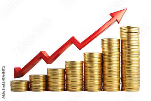 A red upward trending arrow points over stacks of gold coins, symbolizing financial growth and success, isolated on a transparent background