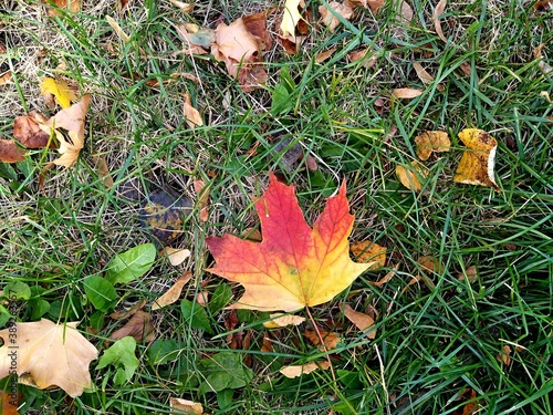 A red yellow maple leaf fell on the green grass on Star Boulevard in Moscow.