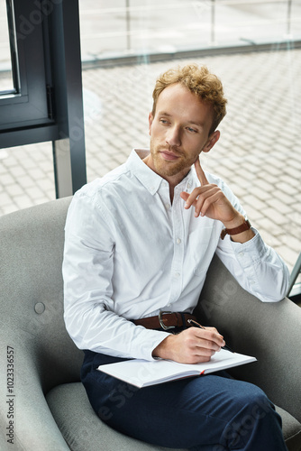 A redhead businessman in a white shirt thoughtfully works on project ideas in a contemporary office.