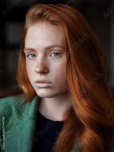 A redhead girl with green eyes and a little freckles on her face, the model's beauty.