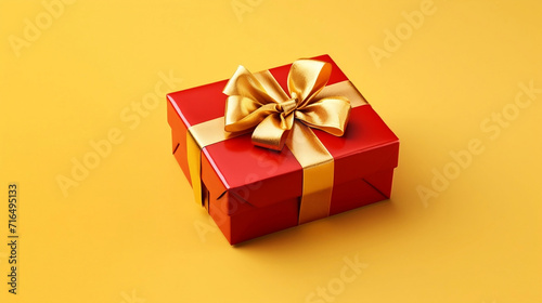 A red-wrapped gift on one side of the picture against a yellow background. Aerial view