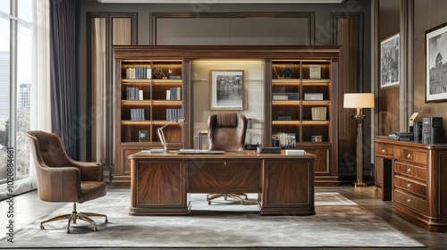 A refined home office with elegant wooden furniture, luxurious decor, and soft lighting, creating a sophisticated workspace