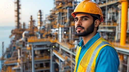 A refinery worker wearing safety gear poses for a photograph