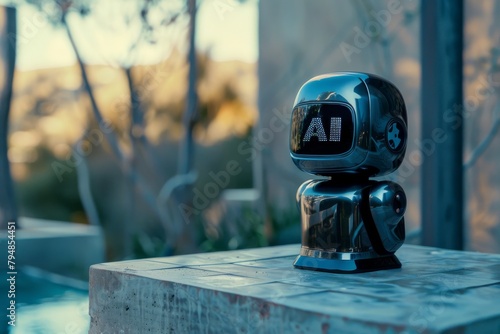 A reflective robot head displaying AI on its screen stands against a blurred nature backdrop, evoking futuristic concepts