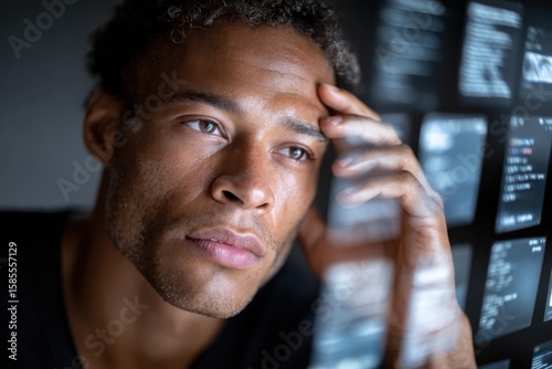A reflective young man gazes thoughtfully at a futuristic digital interface, representing the intersection of technology and introspection in a modern workspace environment.