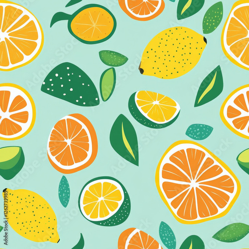 A refreshing citrus fruit pattern with oranges, lemons, and limes in bright, juicy colors