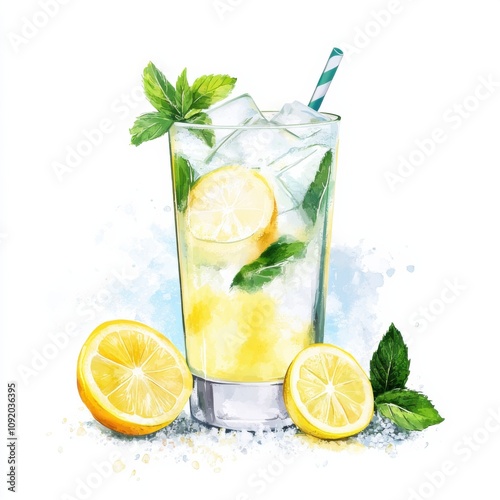 A refreshing citrus mint cooler with lemon slices and fresh mint leaves, served in a tall glass with crushed ice, isolated white background