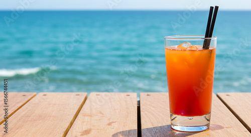 A refreshing cocktail is presented on a wooden surface with the endless blue ocean. A vibrant and invigorating beverage, inviting a moment of pure relaxation against a backdrop of natural beauty.