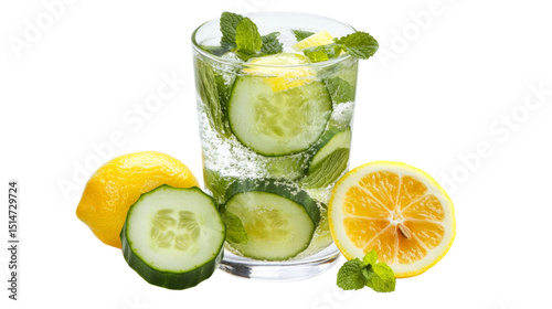 A refreshing cucumber-infused water with lemon and mint, served in a clear glass,Transparent background, PNG file