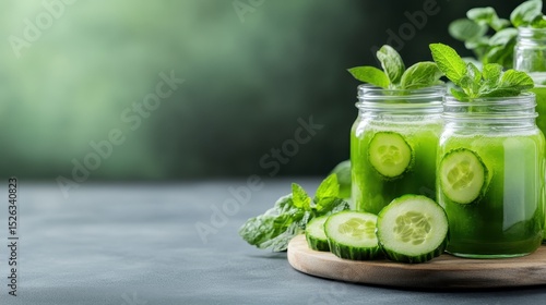 A refreshing display of cucumber-infused drinks garnished with fresh mint leaves, presented in glass jars, perfect for hot summer days and healthy hydration.