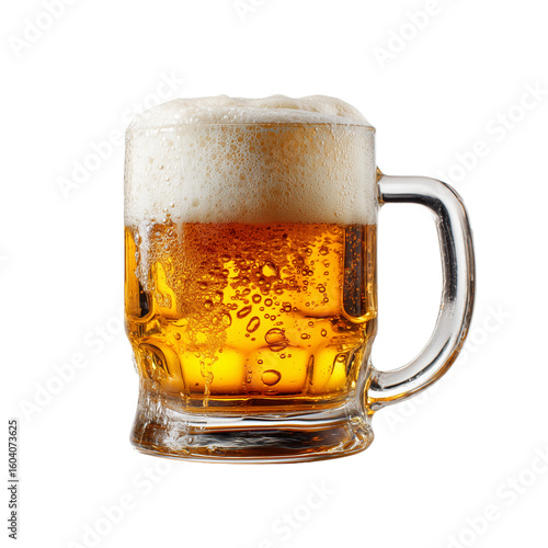 A refreshing glass mug filled with golden lager beer and a thick frothy head isolated on transparent background