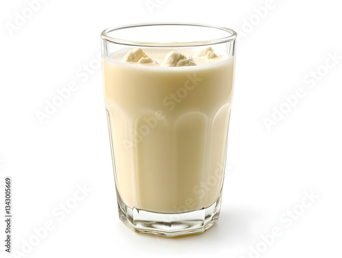 A refreshing glass of creamy yogurt drink with crunchy granola topping sits on a white background.