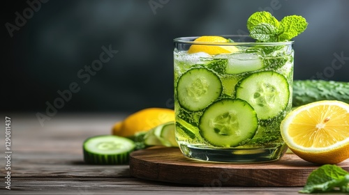 A refreshing glass of cucumber lemonade garnished with mint and lemon showcases a vibrant drink perfect for hot weather, symbolizing health and relaxation.